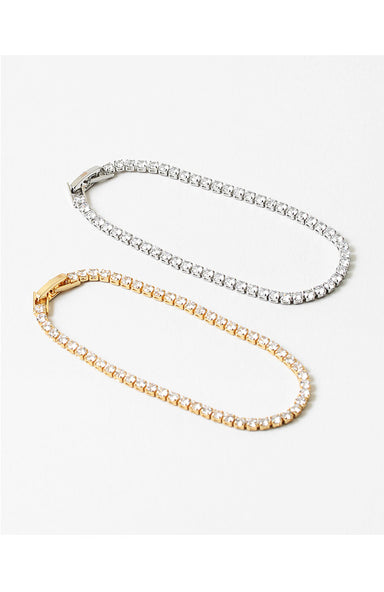 This classic tennis bracelet features a continuous line of brilliant clear stones set in lustrous gold, offering timeless elegance for weddings, pr...