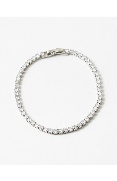 This classic tennis bracelet features a continuous line of brilliant clear crystals set in lustrous silver, offering timeless elegance for weddings...