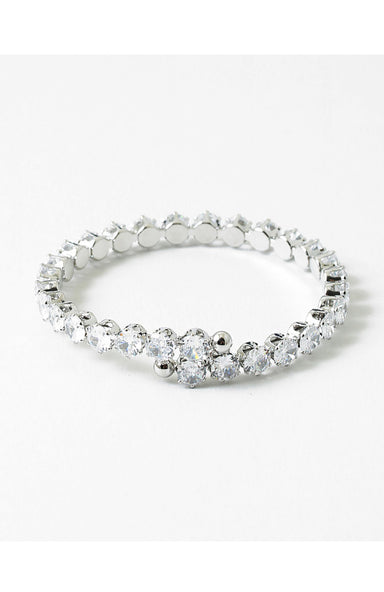 A polished silver cuff adorned with cubic crystal stones, offering sophisticated elegance for holiday gatherings and formal occasions.