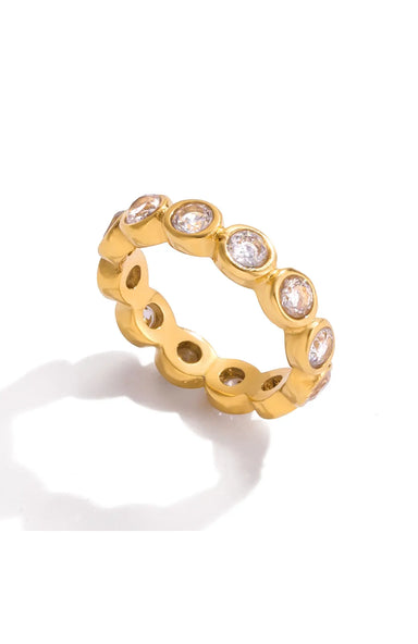 A round cut eternity ring with bright CZ stones for full sparkle in every direction. Made with water resistant stainless steel and perfect for stac...