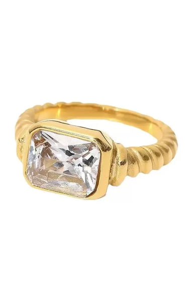 A textured gold ring with a bright emerald cut CZ for a modern, eye catching shine. Made with water resistant stainless steel and easy to style alo...