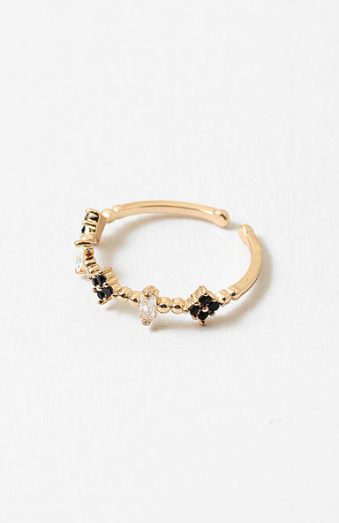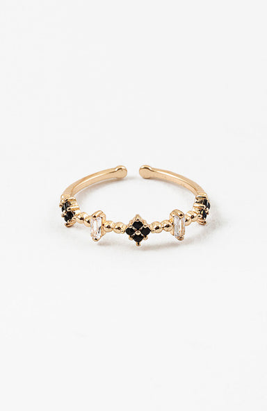 This delicate open-back cubic zirconia clover ring features a striking black stone set in a design that showcases brilliance from every angle.