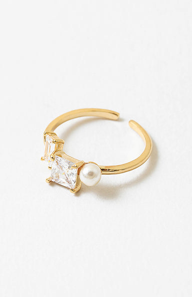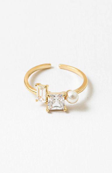 A modern open ring featuring two bright CZ stones in complementary cuts. Made with water resistant stainless steel and perfect for stacking or wear...