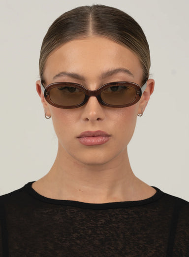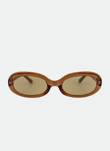 These transparent coffee-hued oval sunglasses evoke a quiet, retro elegance. The warm tone of the acetate frame softens the silhouette, offering a ...
