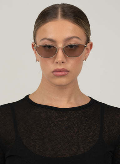 A sleek hexagonal-shaped metal frame in polished silver, offering a modern twist on a classic design. The smoke lenses add a cool understated edge,...