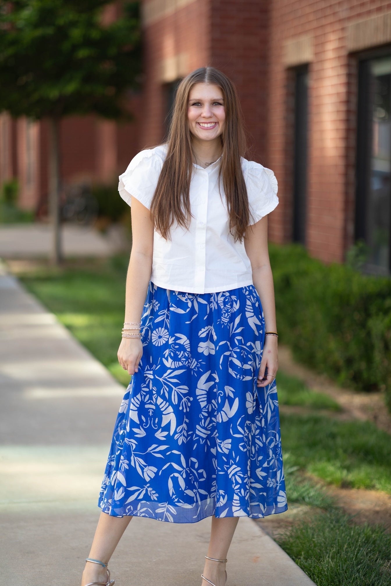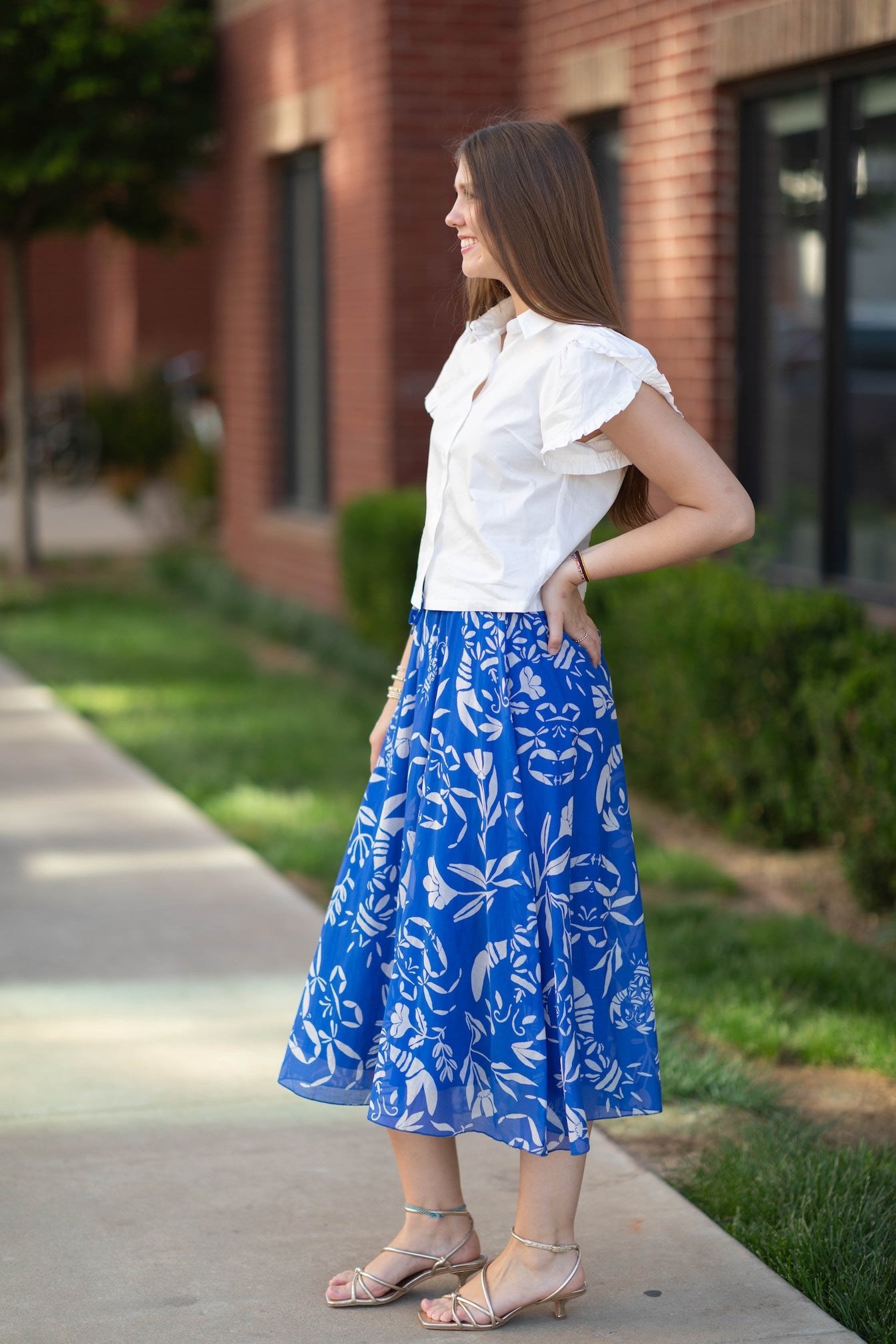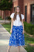 Introduce the Indrany Printed Maxi Skirt, featuring a stunning royal blue print. Made for fashion-forward individuals, this skirt will elevate any outfit with its unique and eye-catching design.