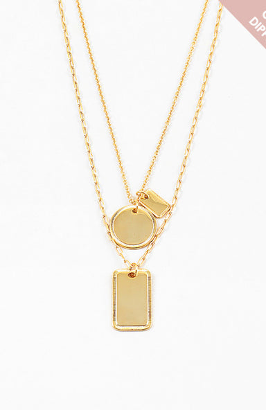 This layered disc pendant necklace features polished gold-toned metal discs suspended on a delicate chain, creating dimensional movement and a soph...