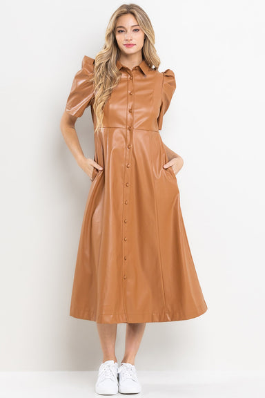 Turn heads in this black faux leather button-down dress, designed with a sleek V-neckline and bold front button detail. Its edgy yet chic silhouett...