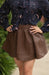 The Chelsey Skirt combines style and versatility with its rich brown faux leather fabric, making it an ideal choice for fall. Its mini length offers a modern silhouette that pairs effortlessly with sweaters and boots for a polished seasonal look.