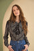 The Frances Top in Aces Wild Black offers a refined twist on a classic button-up. Designed with a tailored fit, it features a button front, long sleeves with button cuffs, and an elegant scarf collar detail that adds a touch of western sophistication.