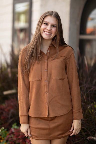 Keep it classic with this camel faux suede button-down top, designed with chest pockets and a relaxed fit. Its soft, suede-like texture makes it pe...