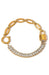 A bold gold link bracelet with a sparkling baguette crystal section and a modern lock detail. Water resistant and perfect for stacking or worn alone as a standout piece.
