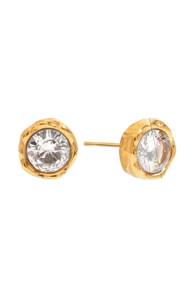 Water resistant gold studs with a bezel and brilliant stone for effortless shine. Details: Stainless Steel Gold Water Resistant, Tarnish resistant