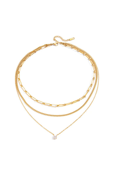 A triple layered necklace featuring a paperclip chain, a curb chain, and a dainty CZ drop for a ready to wear stacked look. Made with water resista...