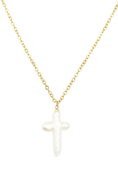A delicate gold link chain featuring a genuine freshwater pearl shaped into a natural cross. Each pearl has its own organic form and texture which ...