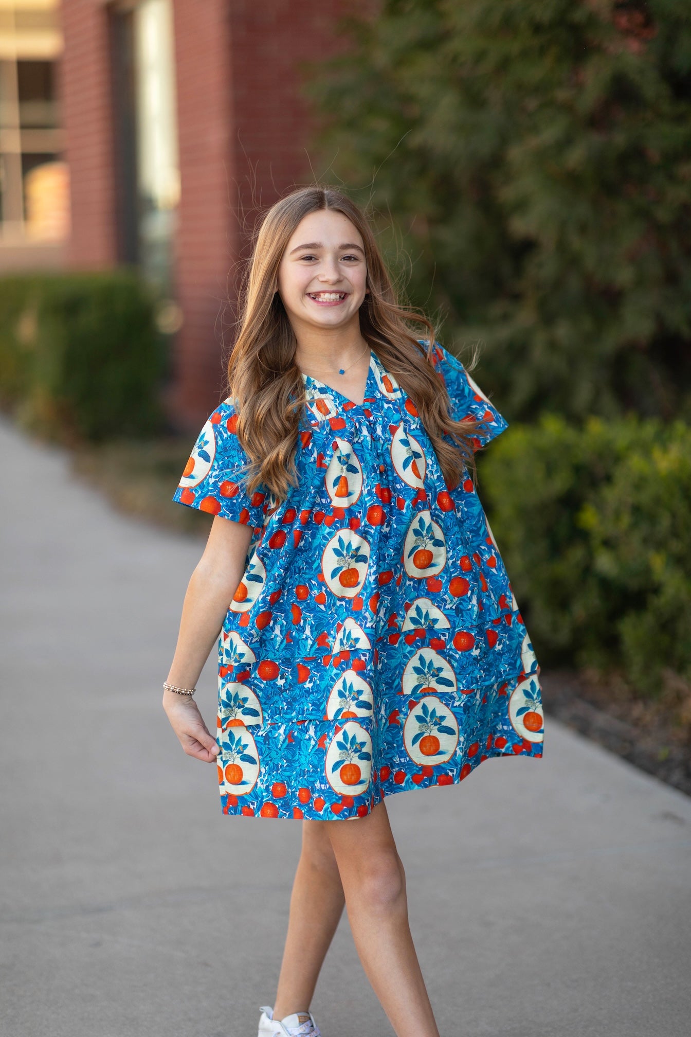 This lightweight dress features a comfortable design with a warm-weather-ready orange grove print.