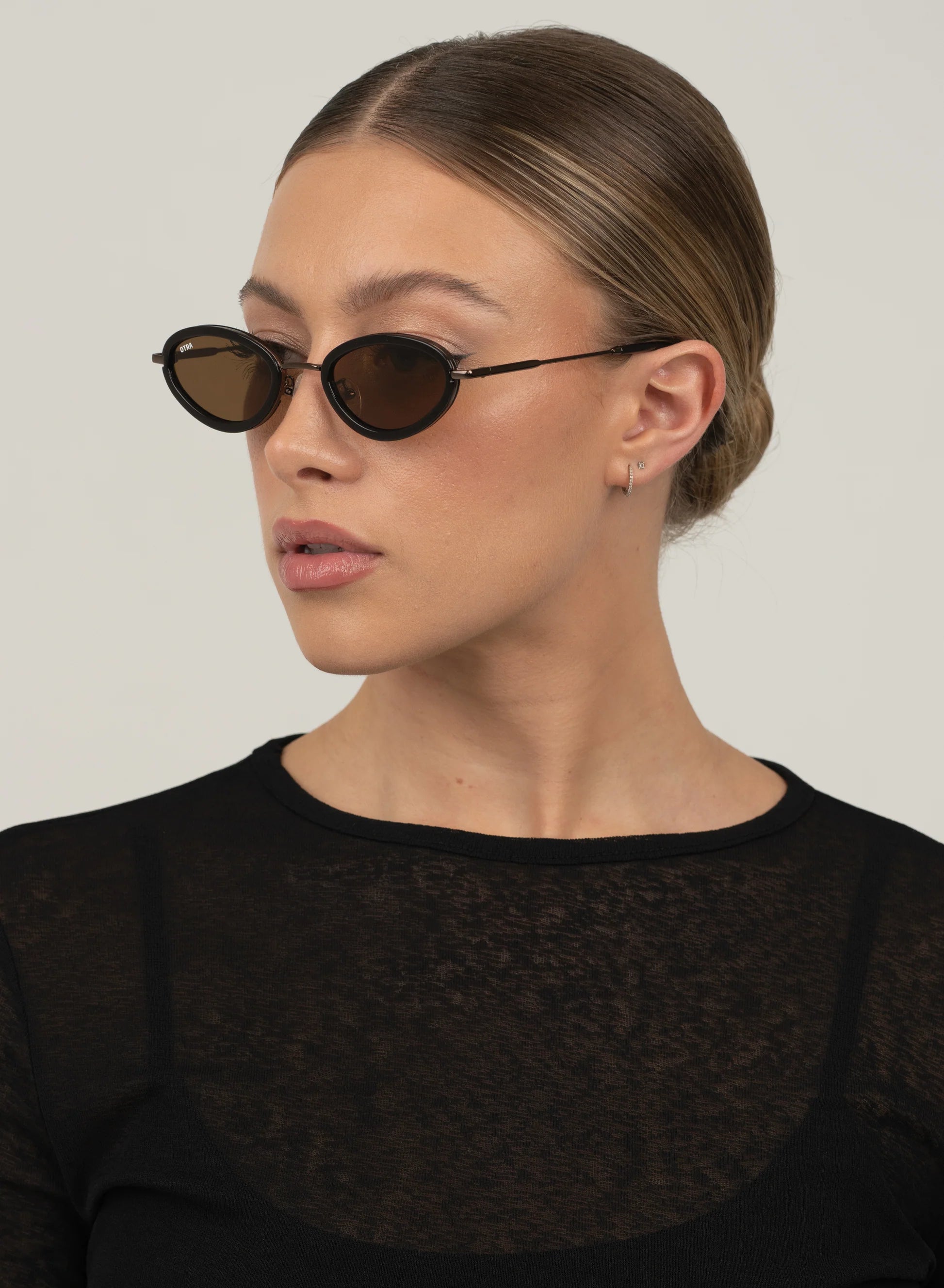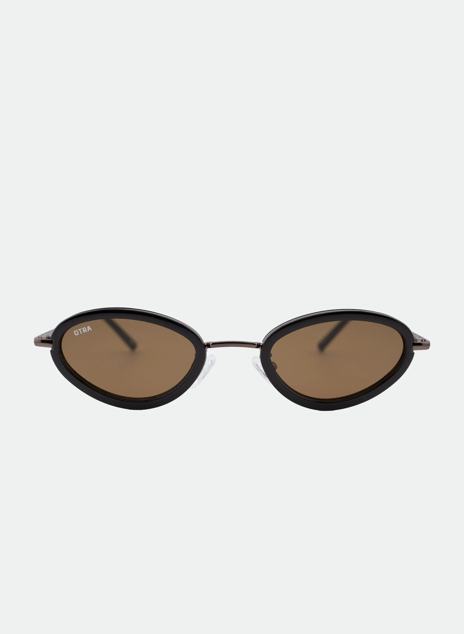 This thin oval frame features a rich chocolate plastic body complemented by a sleek brown metal rim for a warm, sophisticated look. Paired with brown lenses, it offers a seamless, tonal aesthetic with a vintage-inspired touch.
