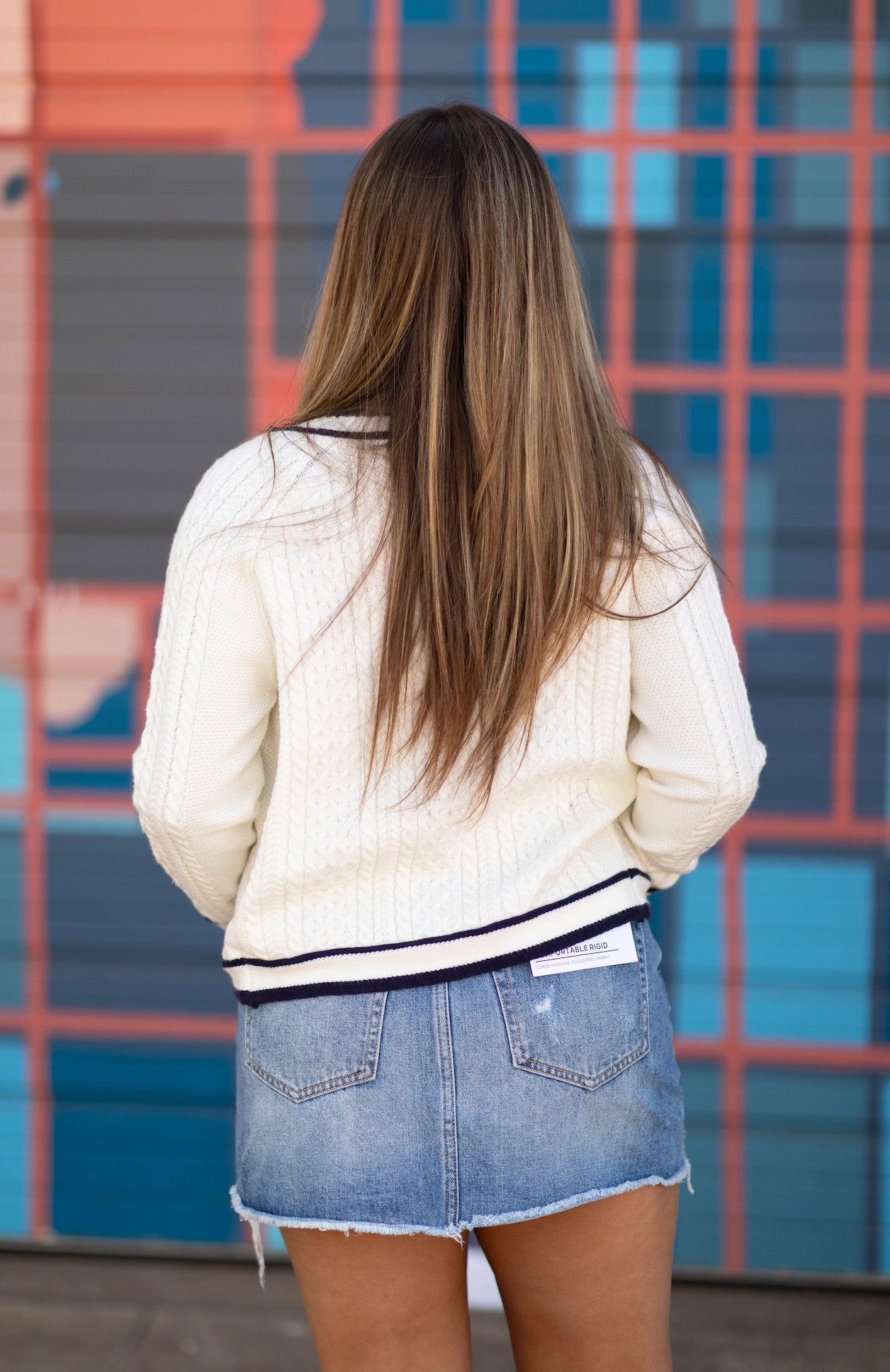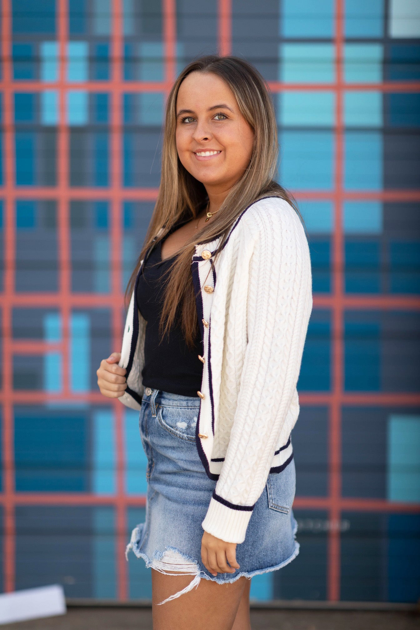 Elevate your wardrobe with this stylish Navy and White Contrast Cable Knit Cardigan, designed to bring a touch of sophistication to any outfit. The timeless cable knit pattern creates texture and depth, while the contrasting navy and white colors offer a modern, chic twist on a classic design.