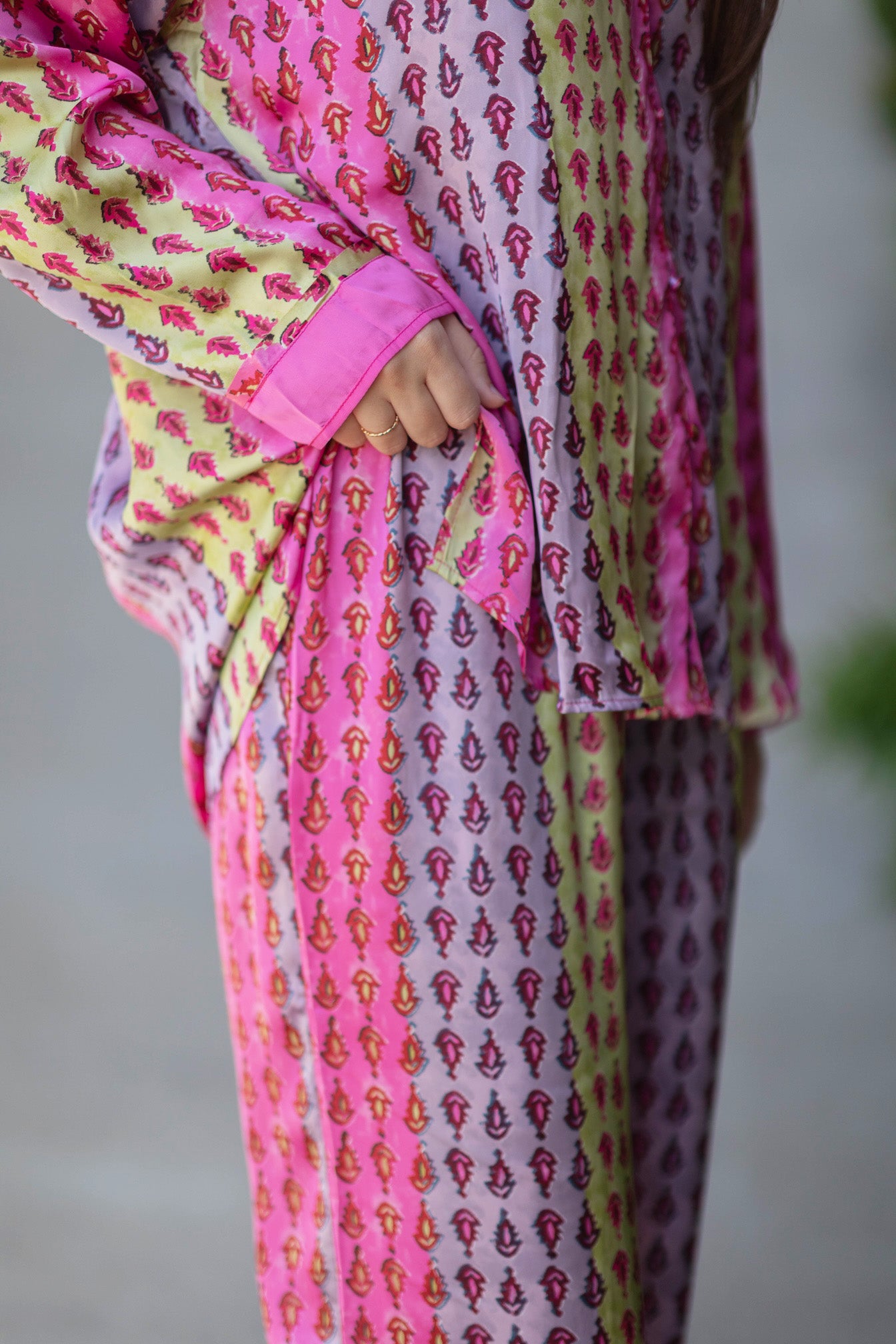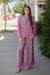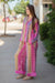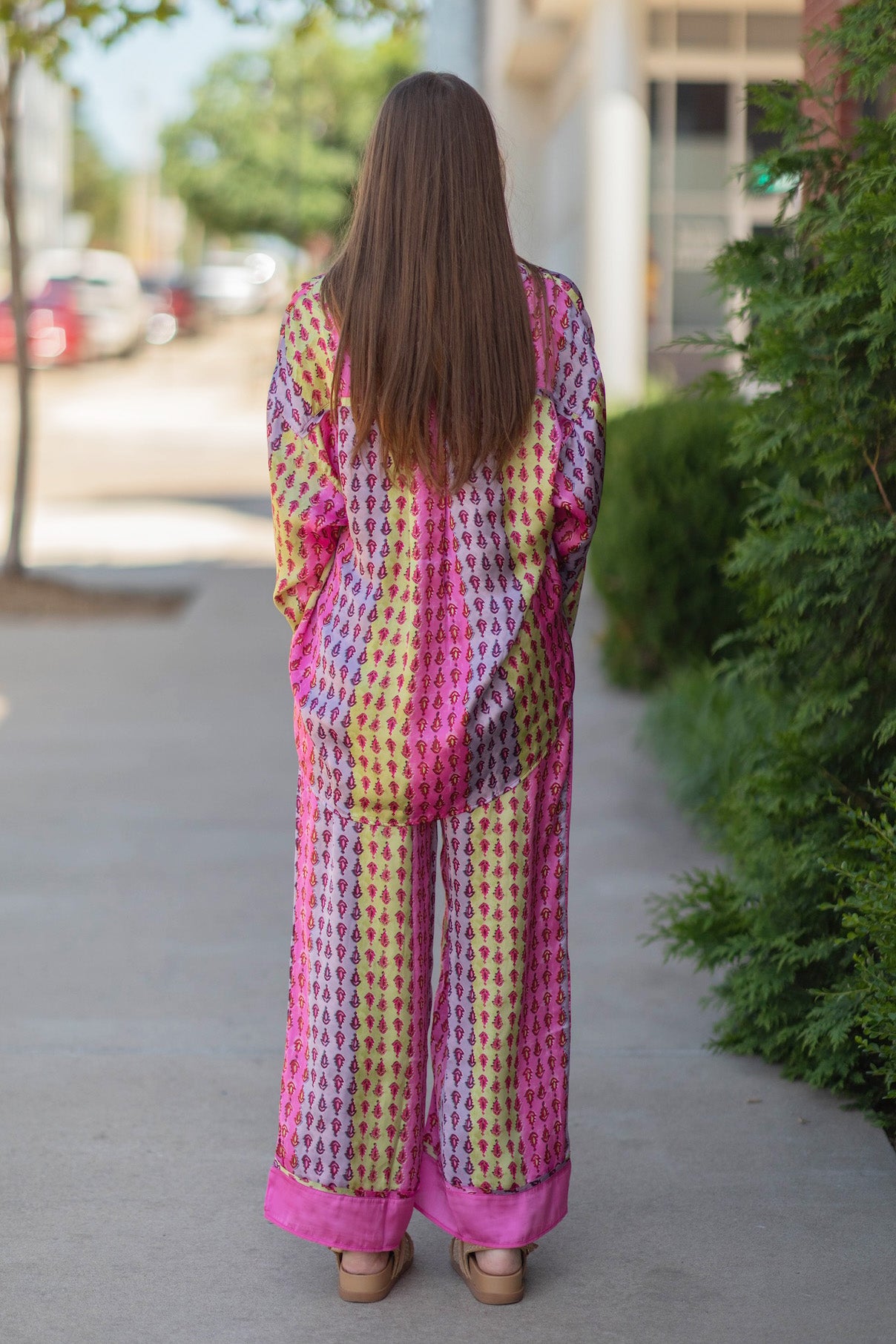 Features: Lightweight and breathable, soft printed fabrication, button-front top, elastic waistband with adjustable drawstring, wide-legs.