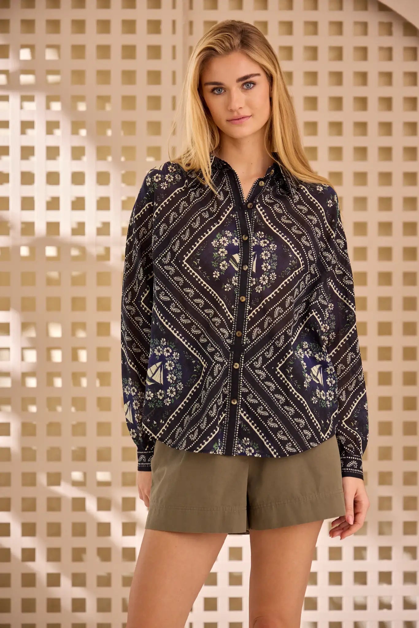 The Miles Shirt is back in our coastal Bon Voyage print and crafted from a lightweight silk cotton viscose blend that feels soft, breathable, and effortlessly airy. Designed with a relaxed fit, pointed collar, and classic button front, it features long sleeves with button cuffs and a patch breast pocket for a timeless touch.