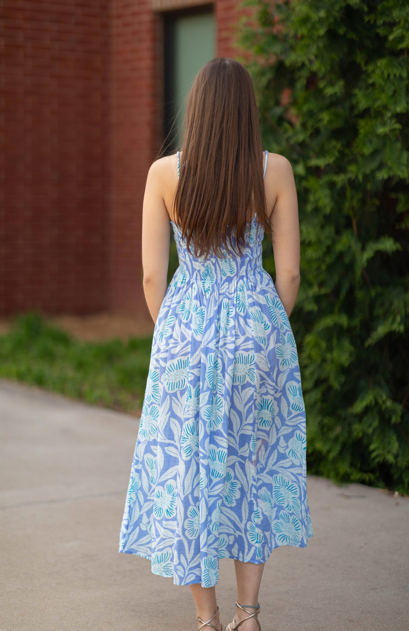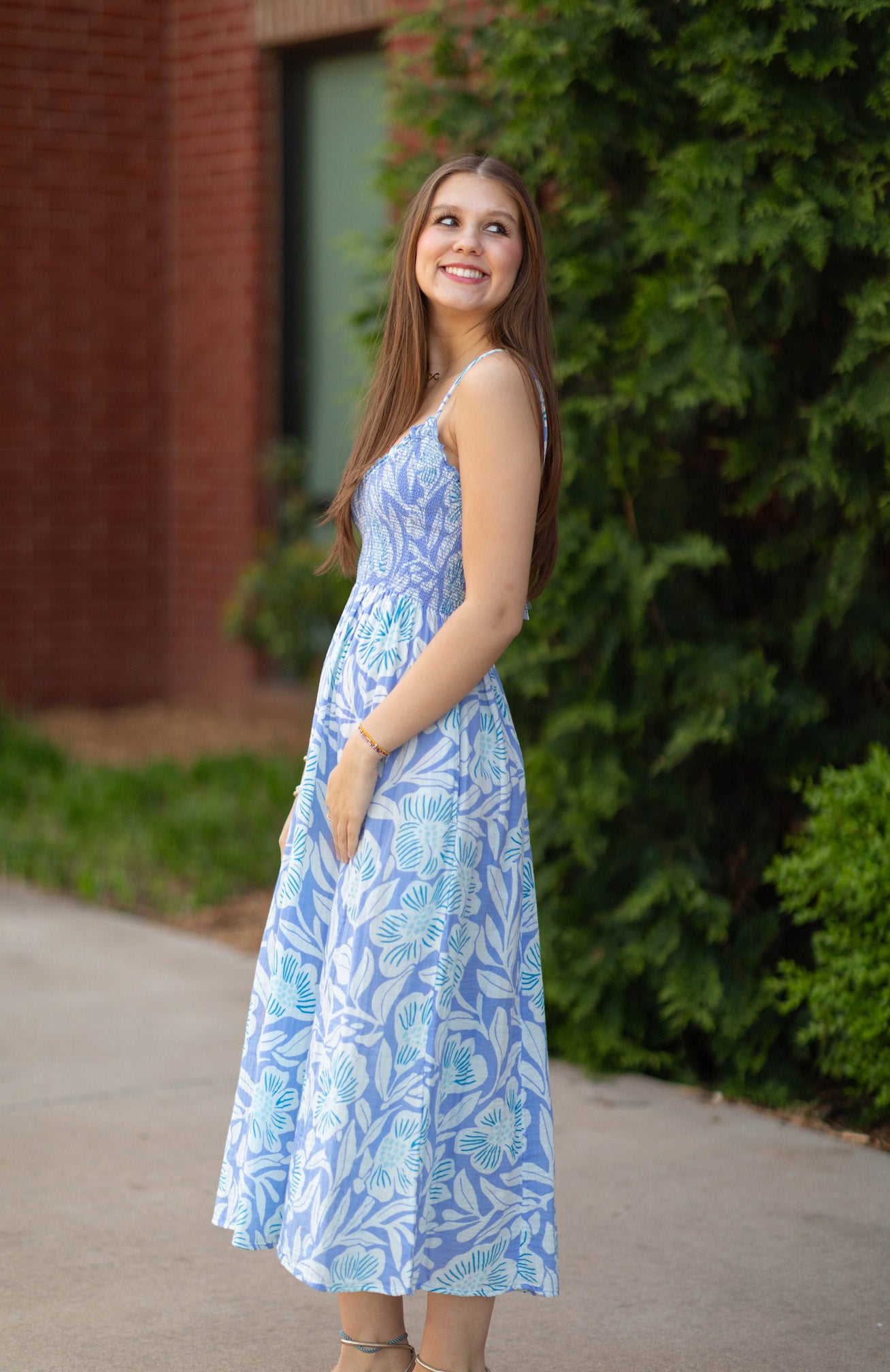 Made to be dressed up or down, this midi is featured in a soft cotton fabrication and printed design with a smocked bodice and classic scoop-neckline.
